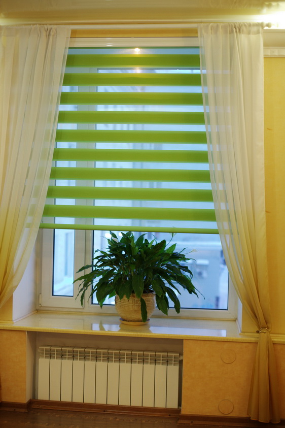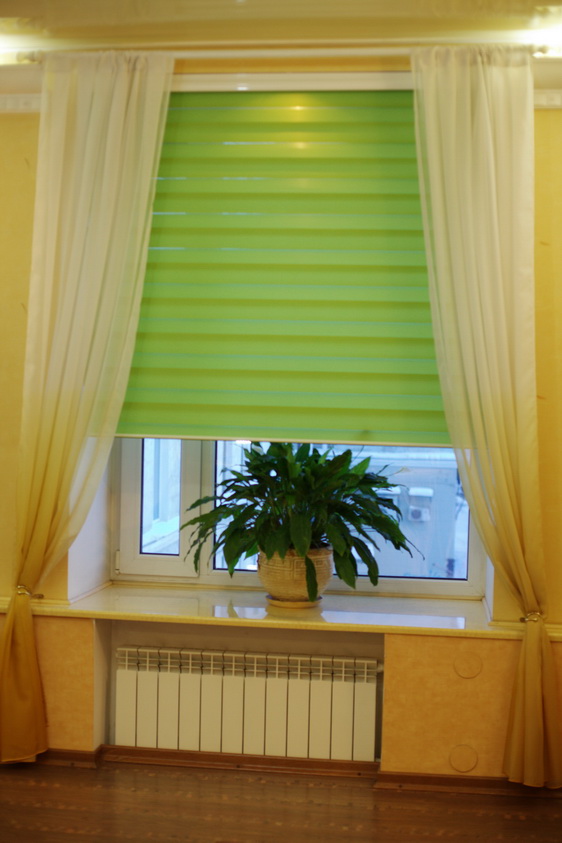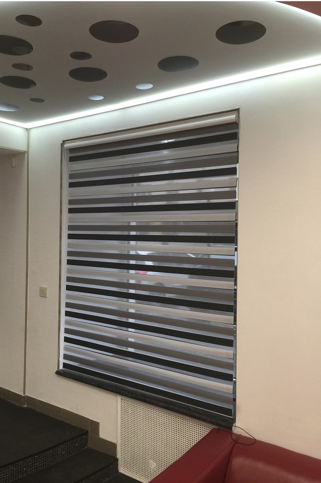 Второе название штор "Зебра" - "День и ночь". Получили их шторы за структуру ткани, из которой изготовлены - плотные полосы чередуются с сеткой. Регулировка светового потока осуществляется с помощью сдвига одних полос по отношению к другим.